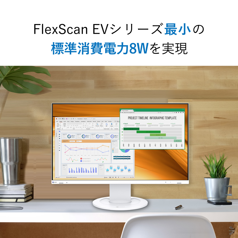 FlexScan EV2400Rは、従来機種FlexScan EV2460(以下EV2460)の基本性能を踏襲しながら、環境に配慮した製品開発を強化し、国内外の最新の環境規格に適合しました。また、FlexScan EVシリーズにおいて最小となる標準消費電力8Wを実現します。