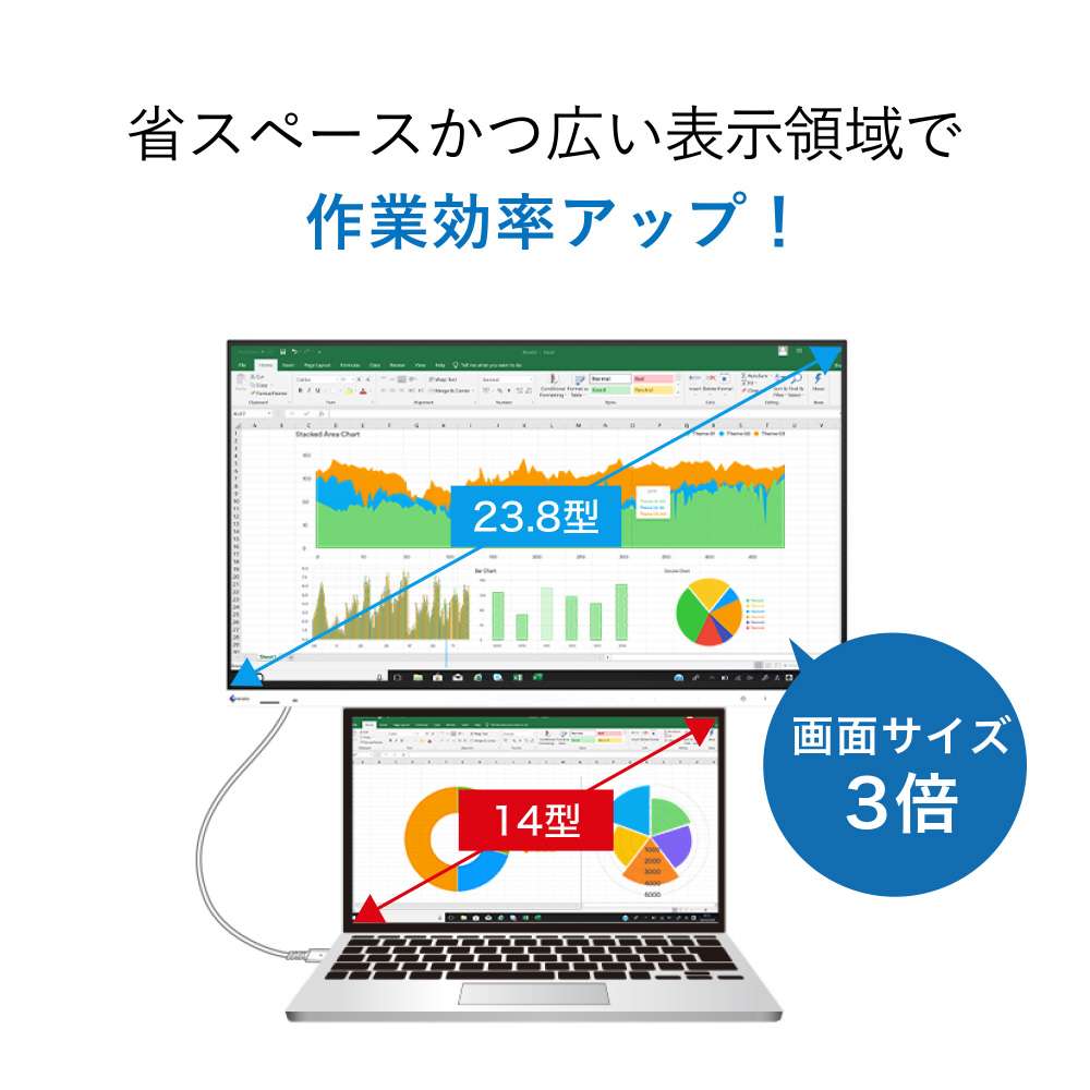 23.8型フルHD(1920×1080ピクセル)解像度のIPSパネルを搭載。ノートPCと接続することにより、例えば14型のノートPCと比較した場合、画面サイズが約3倍に広がるため、ウィンドウの切替えやスクロールの回数が減り、