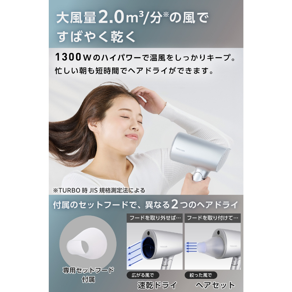 大風量2.0m3/分(※)の風で速乾ドライやモード変更でいたわりドライなど、モードや付属のセットフードを組み合わせてシーンによって使い分け。3段階の風量と2つのモードでお好みの使い方を選べます。※TURBO時JIS規格測定法による