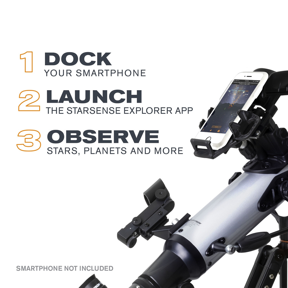 この望遠鏡の最大の特徴は、専用のスマートフォンドックと、特許取得済みの「StarSense Explorerアプリ」を組み合わせた導入アシスト機能です。