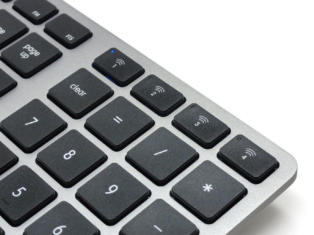 Matiasのワイヤレスキーボードは4つのデバイスとペアリングすることが可能です。ボタン操作一つで登録したデバイスを容易に切り替えることができ、特定のキー操作で接続するデバイスのレイアウトに設定変更することが可能です。