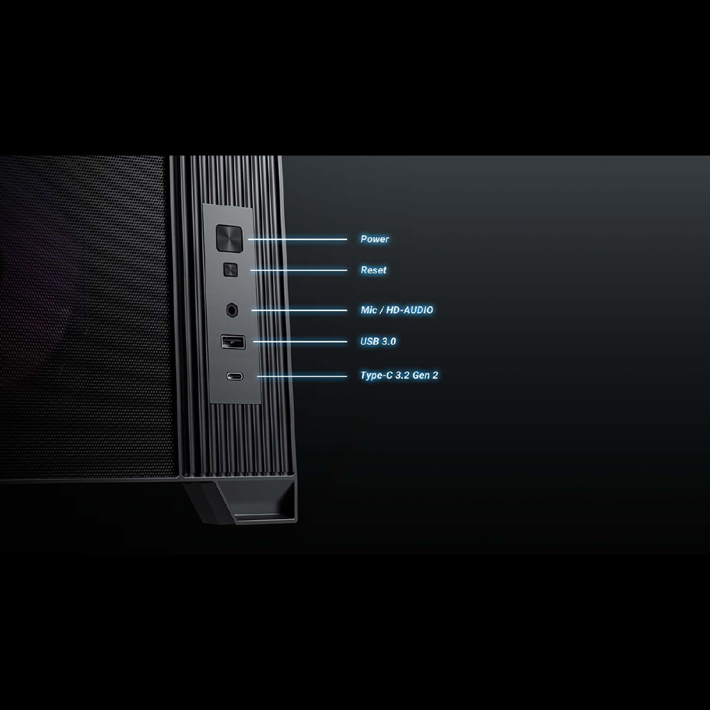ケースフロントトップには、日常的に使う電源スイッチ、リセットスイッチ、USB 3.0、USB Type-C 3.2 Gen 2、Audio in/outを備えています。