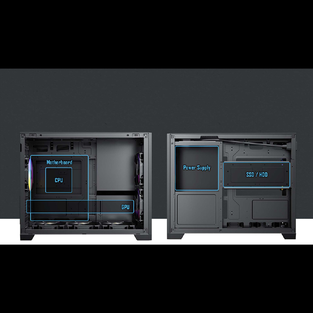 FLUX Mは、フロントに120 mmファンを2基、ボトムに120 mmリバースファンを3基、リアに120 mmファンを1基標準搭載した強化ガラス搭載のミニタワーPCケースです。フロントファン2基による余裕のあるエアフローがシステム部分を冷却し熱のこもりを解消、サイドの強化ガラスパネルは表面にネジ穴を設けないことで工具を使わずパネルを簡単に脱着出来ます。更にボトムに120 mmリバースファンを標準搭載、グラフィックカードをダイレクトに冷却します。トップに最大で360 mmの大型ラジエーターにも対応し、最大405 mmを確保した拡張カードスペースと、高さ175 mmまでのCPUクーラーを搭載でき、コンパクトでありながら冷却に妥協が無いデザインになっています。また、電源搭載場所はケース前方となり電源延長ケーブルが付属します。