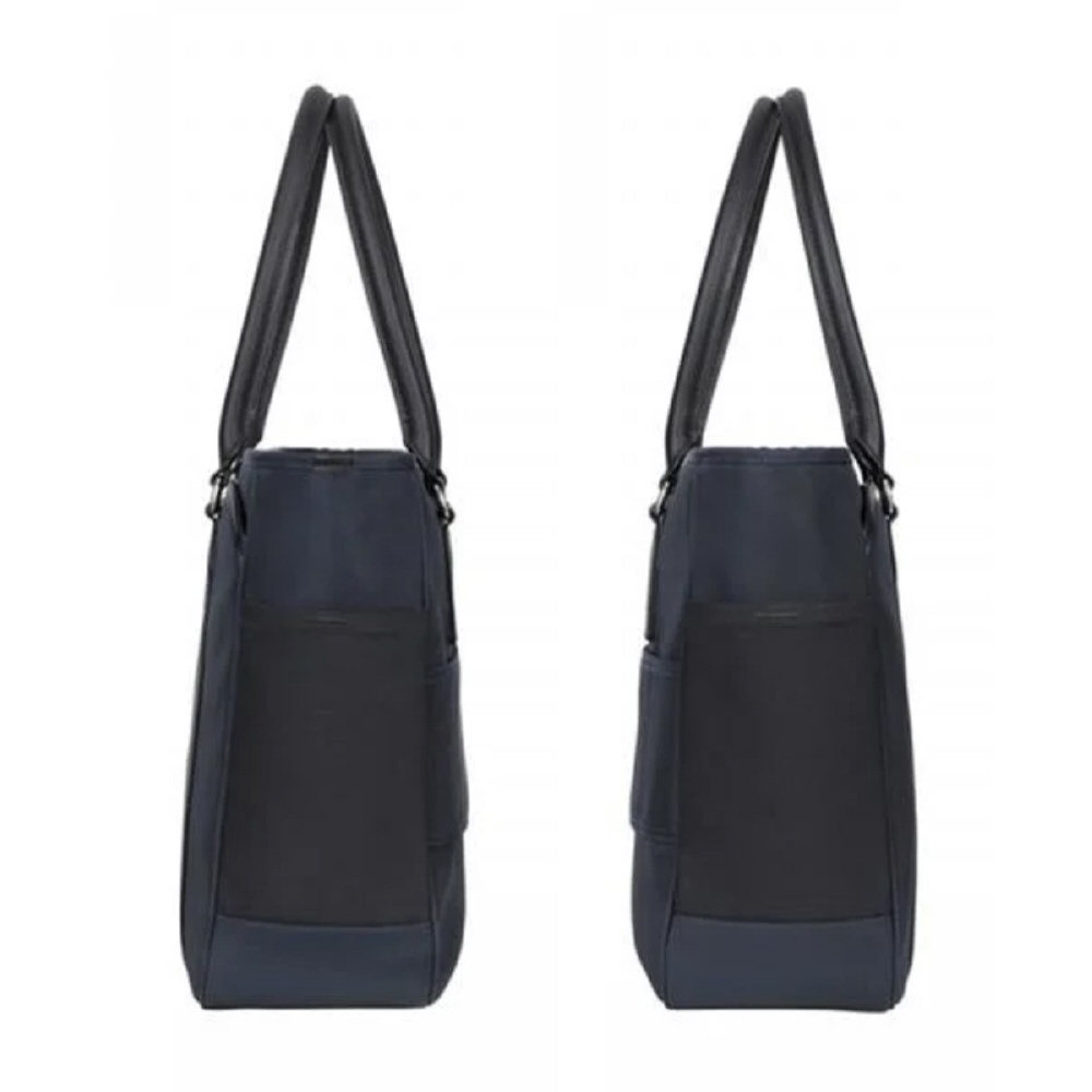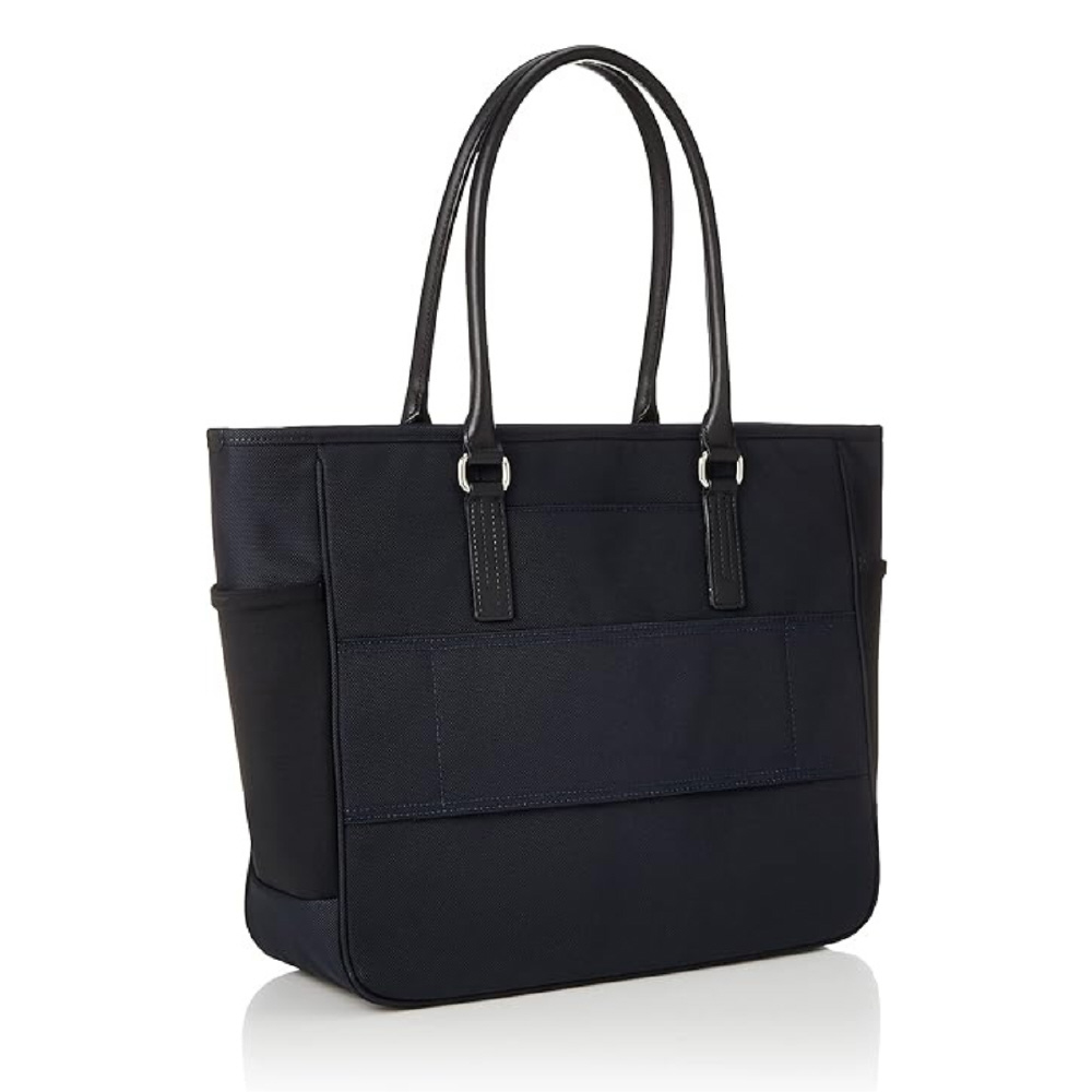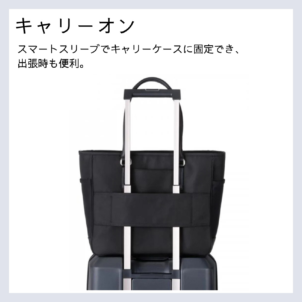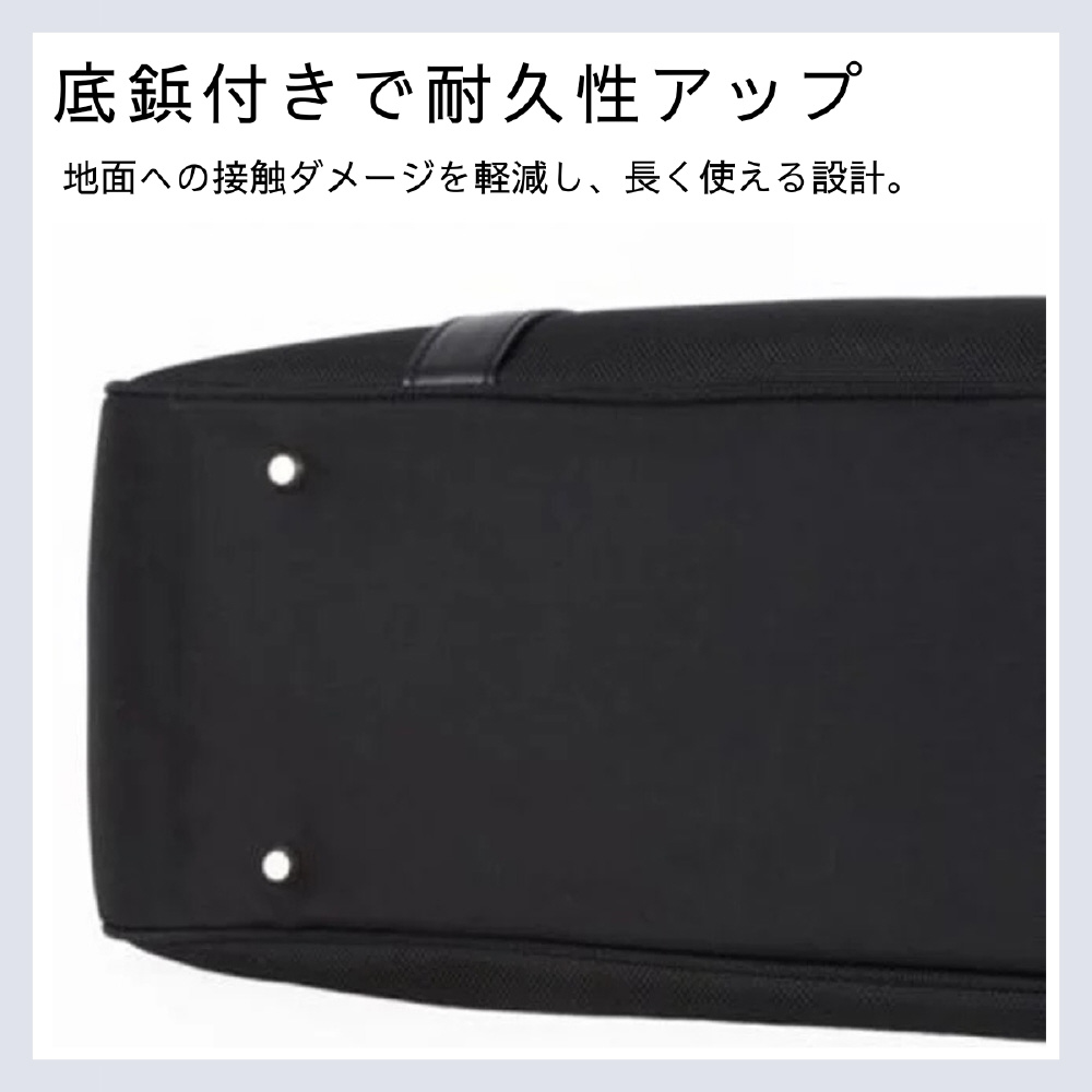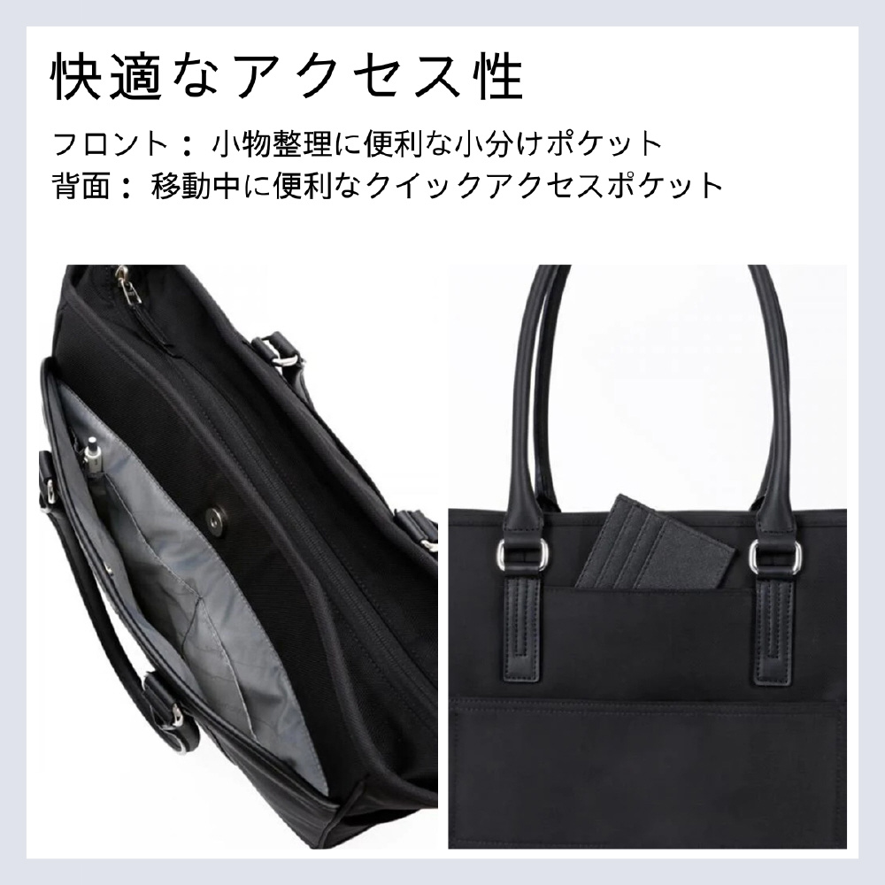 肩掛けしやすいハンドルと豊富な収納を備えた、通勤に最適な撥水ビジネストートバッグ。