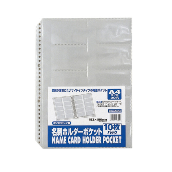 名刺整理の差し替え用ポケット、1台紙名刺20枚収納(両面ポケット)2・4・30穴のA4サイズのファイルに対応、名刺が落ちにくい横から入れるタイプ