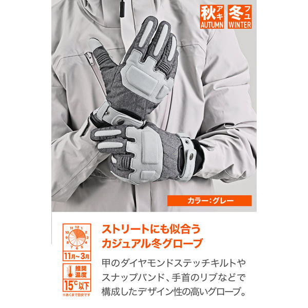 甲のダイヤモンドステッチキルトやスナップバンド、手首のリブなど、デザイン性が高くストリートにも似合う、カジュアルな冬用グローブ。