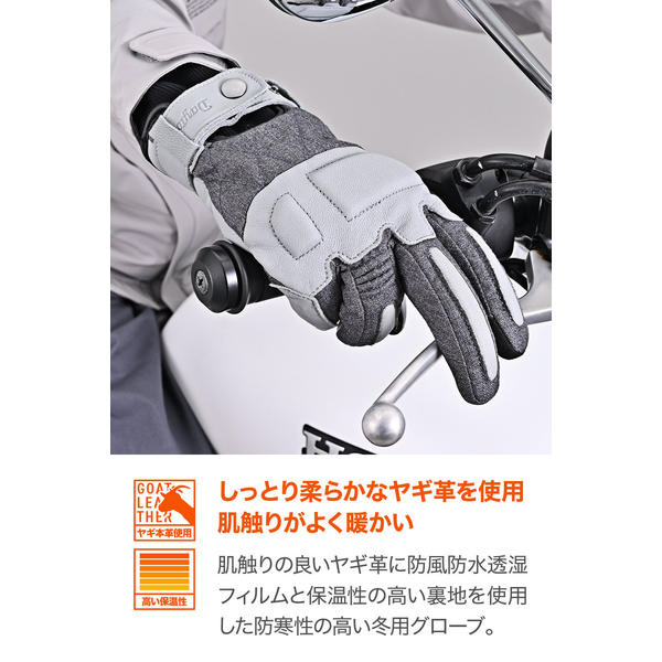 しっとり柔らかな山羊革に、防風防水透湿フィルムと保湿性の高い裏地を組み合わせたカジュアルな冬用グローブ。