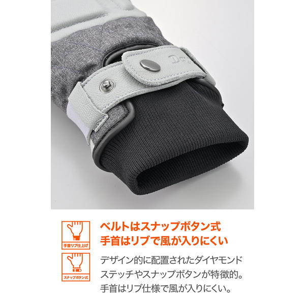 ●甲のダイヤモンドステッチキルトやスナップバンド、手首のリブなど、デザイン性が高くストリートにも似合う、カジュアルな冬用グローブ。