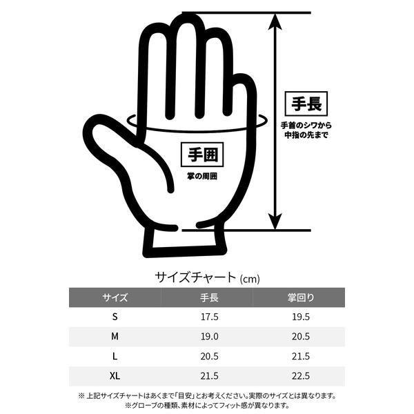 ■サイズチャート:「手長」21.5cm、「掌回り」22.5cm