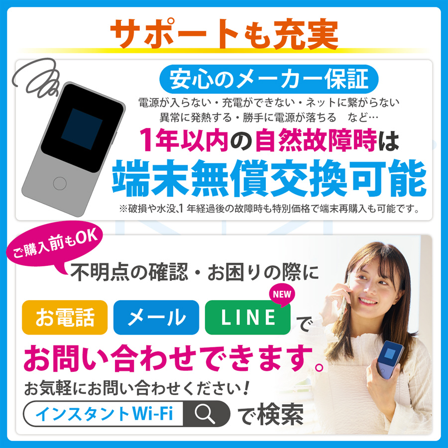 ご購入から1年以内の自然故障時は端末無償交換対応いたします。