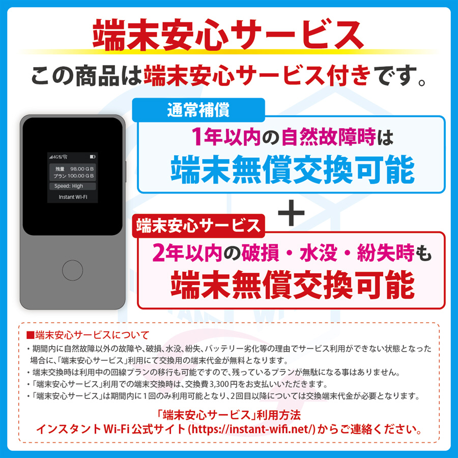 更に、「端末安心サービス」付きだから、2年以内の自然故障以外の故障や、破損、水没、紛失、バッテリー劣化等の理由でサービス利用ができない状態となった場合に、「端末安心サービス」利用にて交換用の端末代金が無料となります。