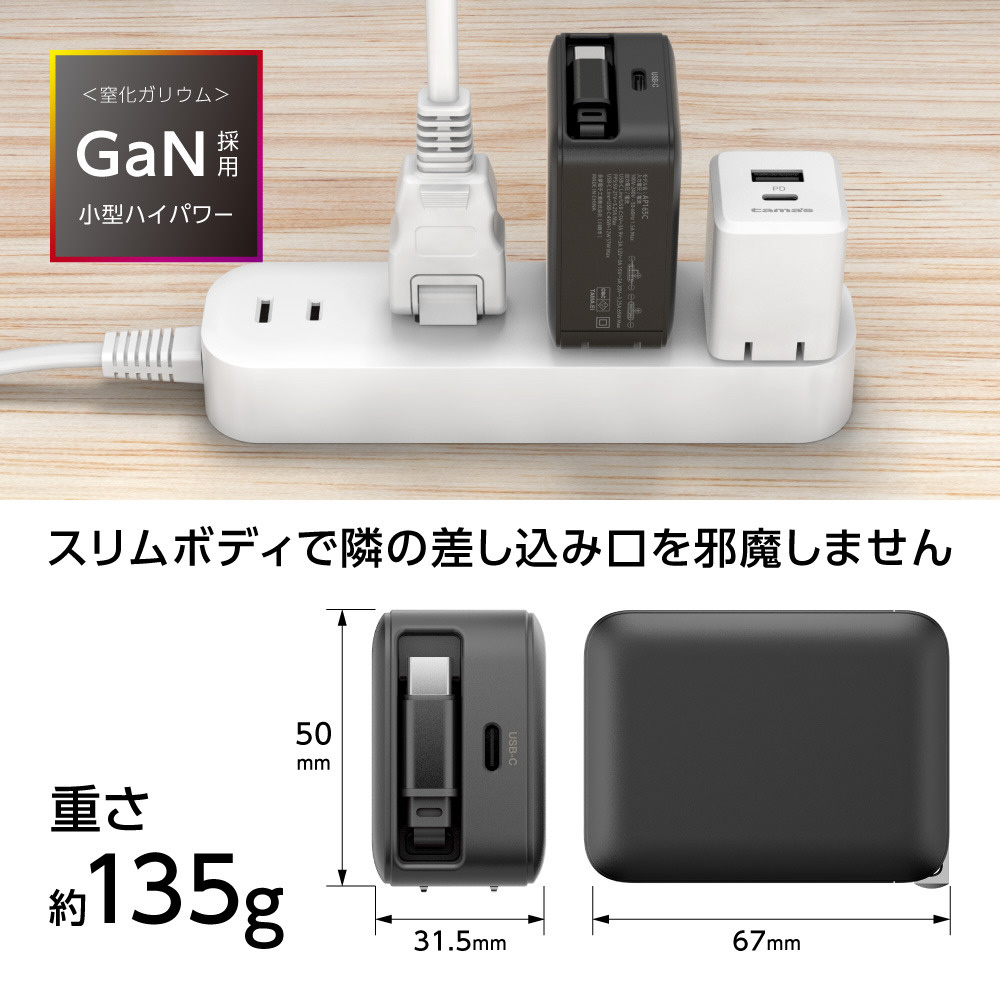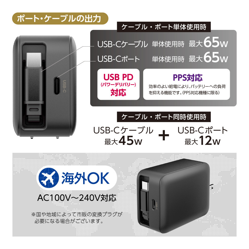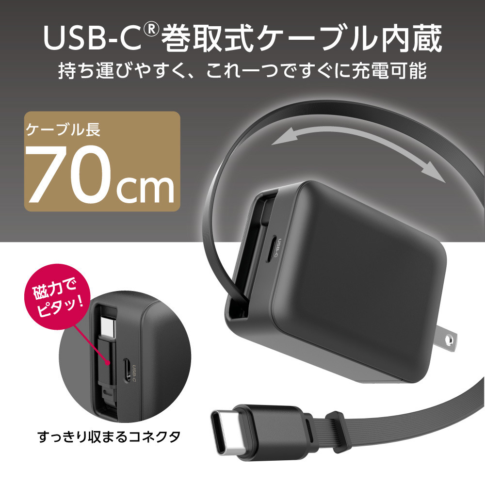 ●単体使用時最大65WのUSB PD(USB Power Delivery)対応 巻取式USB-CケーブルとUSB-Cポートを搭載したAC充電器。