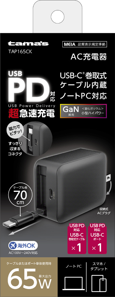 PD65W 巻取式コンセントチャージャー ブラック TAP165CK [USB Power Delivery対応 /1ポート]
