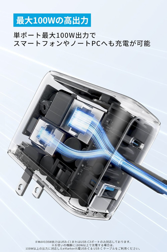 単ポート最大100W出力でスマートフォンやノートPCへも充電が可能