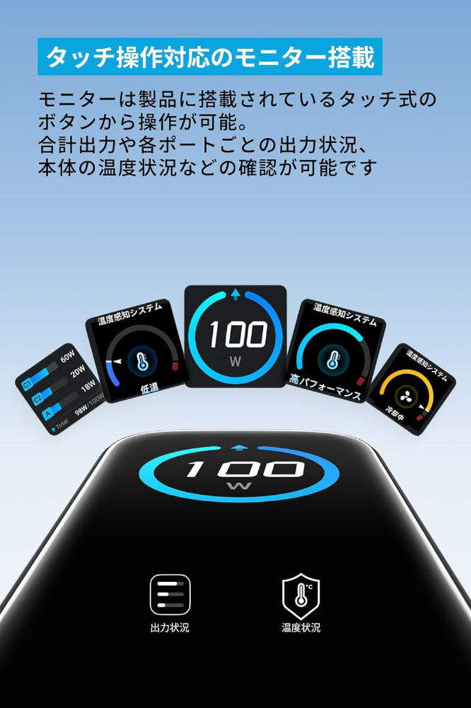 モニターは製品内のボタンをタッチで操作が可能。合計出力、各ポートごとの出力状況や本体の温度状況などを確認が可能です