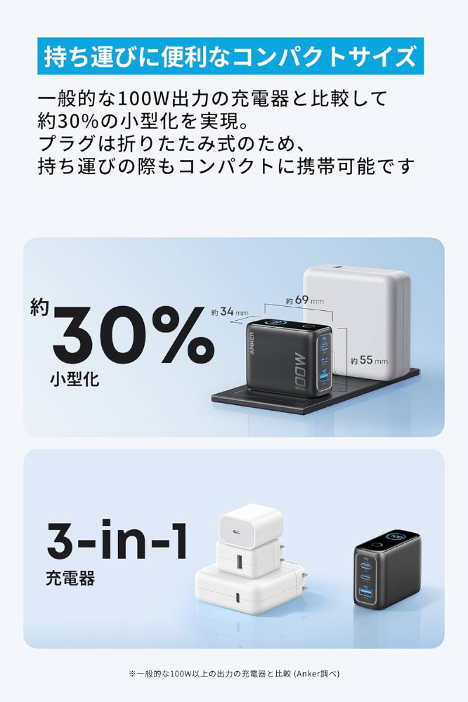 一般的な100W出力の充電器と比較して約30%の小型化を実現。プラグは折りたたみ式のため、持ち運びの際もコンパクトに携帯可能です