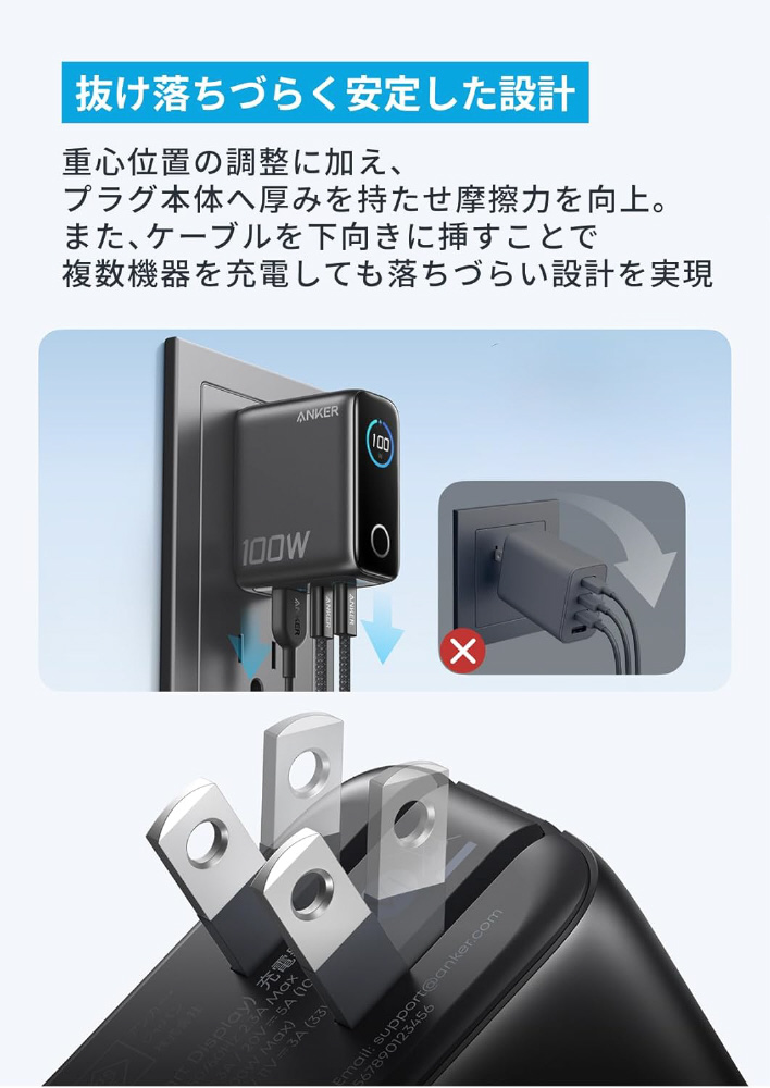 重心位置の調整に加え、プラグ本体へ厚みを持たせ摩擦力を向上。また、ケーブルを下向きに挿すことで複数機器を充電しても落ちづらい設計を実現