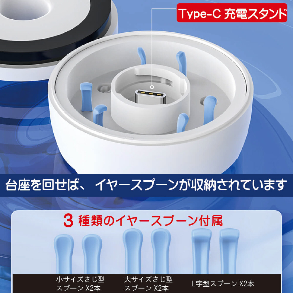 スマホ画面を見ながら耳掃除!必要なとこだけ、掻きすぎ防止。衛生的なほこり対策のキャップや置くだけで充電可能なスタンドが付いた便利なイヤークリーナーです。