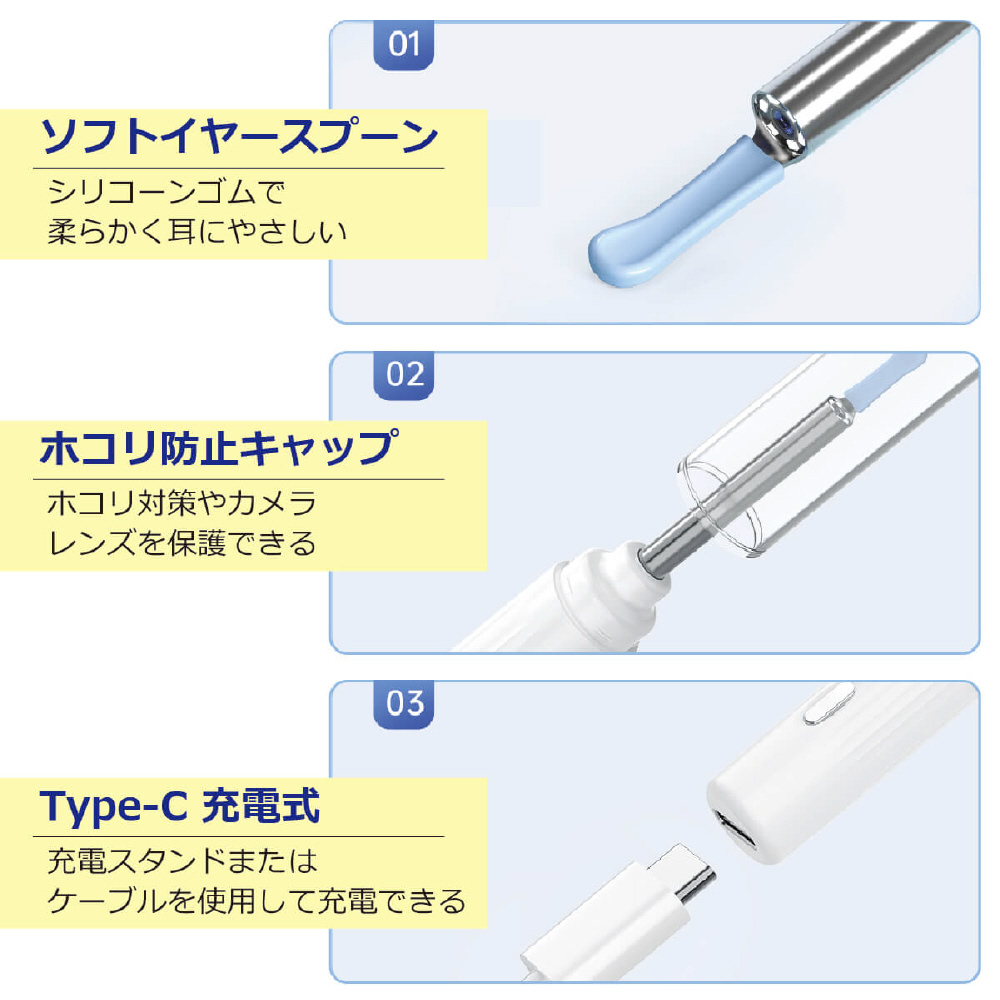 ホコリ防止の保護キャップやレンズとイヤースプーンを水洗いできる防水設計なので、いつでも清潔さを保つことができます。