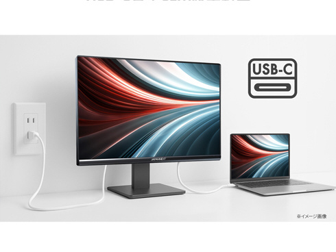 ■インターフェイスはHDMI2.0 x1 (60Hz)、DisplayPort1.4 x1 (60Hz)とUSB-C x1 (60Hz/最大65W給電)を装備し、様々な機器との接続が可能です。USB-C(最大65W給電)は、対応のPCであればUSB-Cケーブル1本でモニターへの映像出力とノートPCへの給電が可能。ケーブル1本でスッキリ接続出来るだけでなく、テレワーク、出社併用の場合などノートPCのACアダプターを持ち運ぶ必要が無くなります。