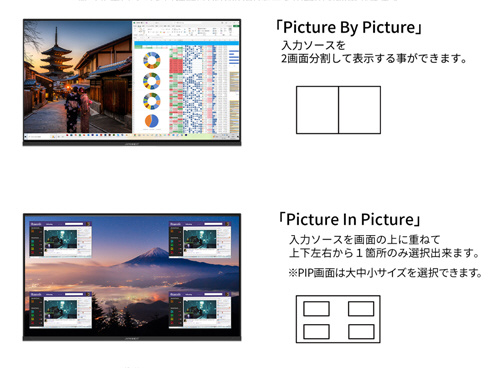 ■複数の入力を同時に表示する「PBP(Picture by Picture)」に対応、PBPモードでは、最大2つの入力映像を左右同時に表示可能。入力の一つを子画面にて表示する「PIP(Picture in Picture)」も可能です。