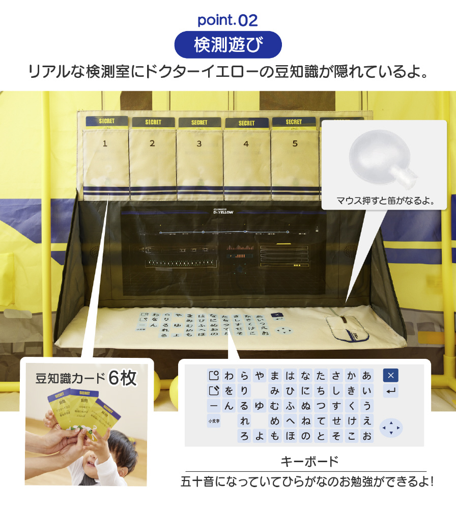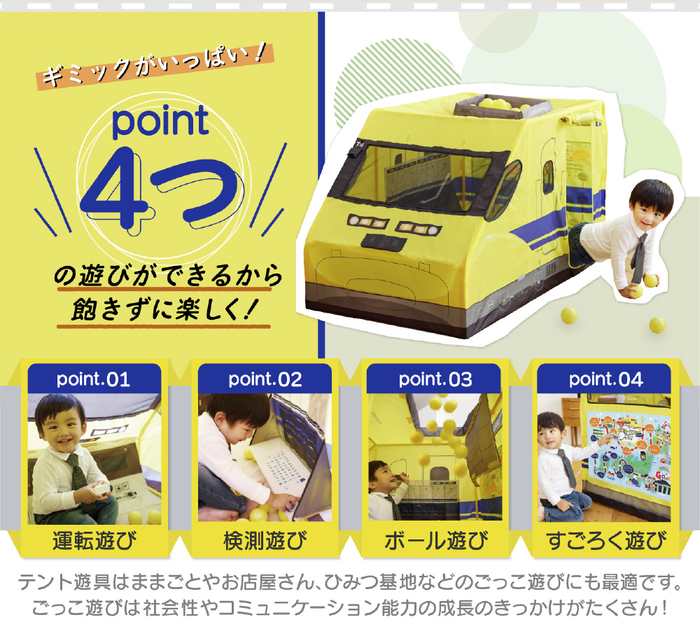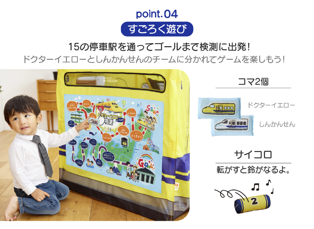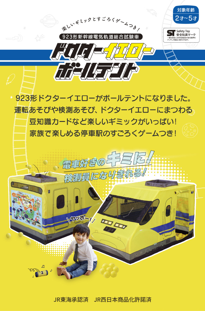 ●923形ドクターイエローがボールテントになりました。運転あそびや検測あそび、ドクターイエローにまつわる豆知識カードなど楽しいギミックがいっぱい!家族で楽しめる停車駅のすごろくゲームつき!