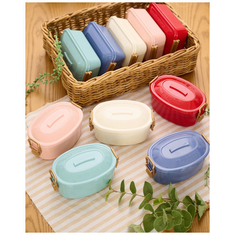 ■「DELICIOUS」の刻印とつやっとした塗装が印象的な2段ランチボックス。