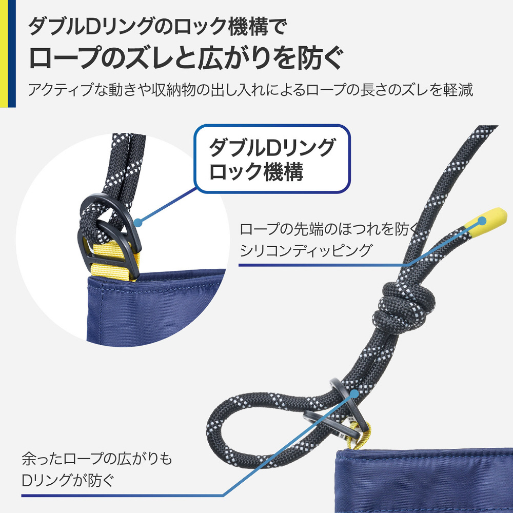 ロープ状のショルダーストラップと、ビビッドなアクセントカラーを散りばめた遊び心あふれるデザインは、フェスやキャンプなどのレジャーシーンにもぴったりです。中敷きを外せば折りたためる構造なので、旅行や出張時に持っていくサブバッグとしても活用できます。