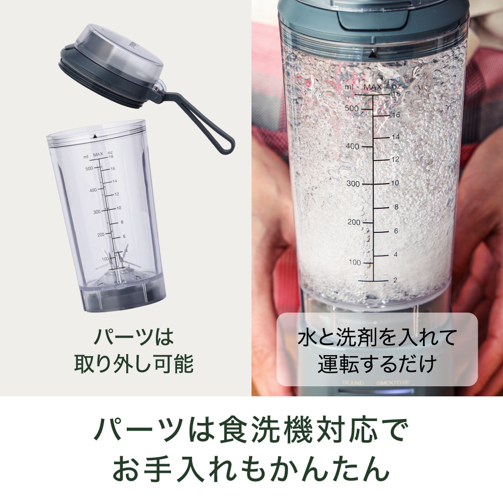 本体とブレンダーカップはワンタッチで脱着OK。ブレンダーカップは飲み口付きなので、できあがりをそのまま飲めます。