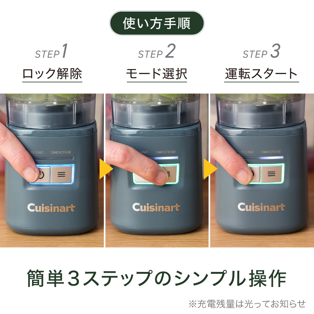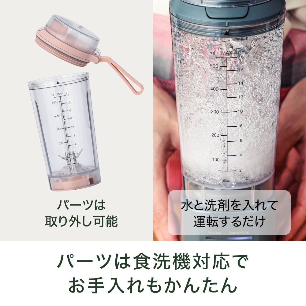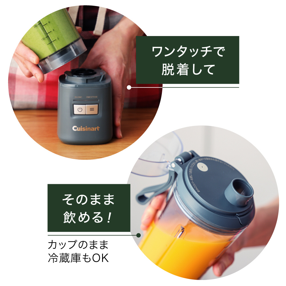 本体とブレンダーカップはワンタッチで脱着OK。ブレンダーカップは飲み口付きなので、できあがりをそのまま飲めます。