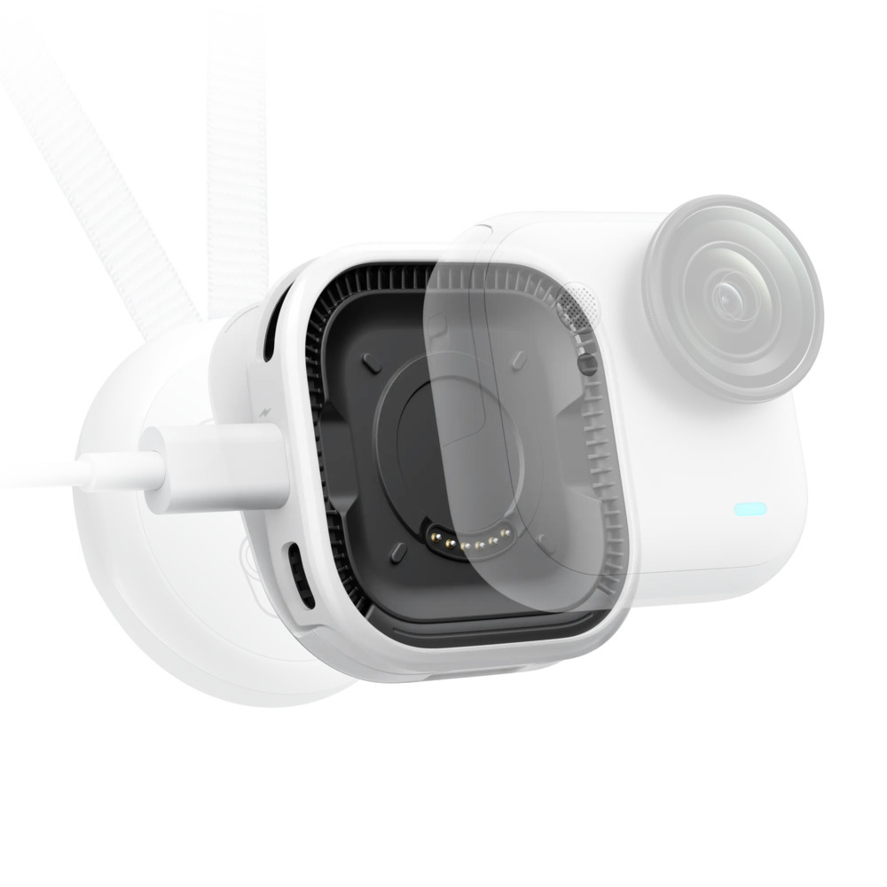 マグネット式ポゴピン・ベースが単体カメラを固定し、USB-C端子が充電器やモバイルバッテリーを接続して超長時間駆動を可能にします。