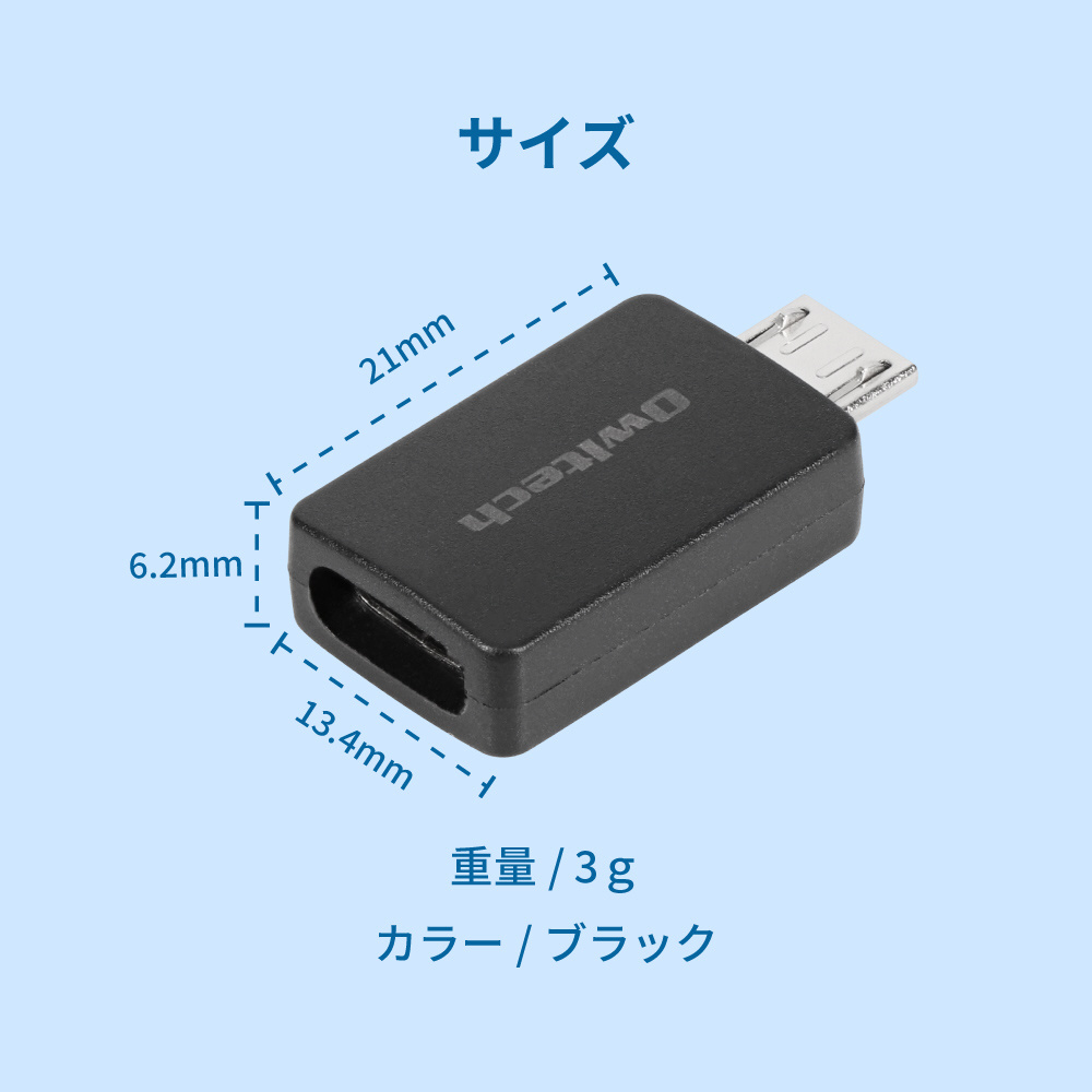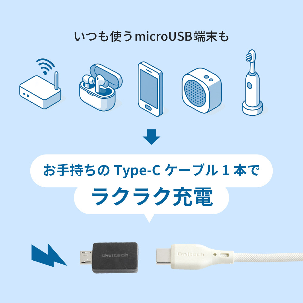 新たにmicroUSBケーブルを買い足すことなく、本製品をお手持ちのUSB Type-Cケーブルに装着するだけでmicroUSB搭載機器をお使いいただけます。