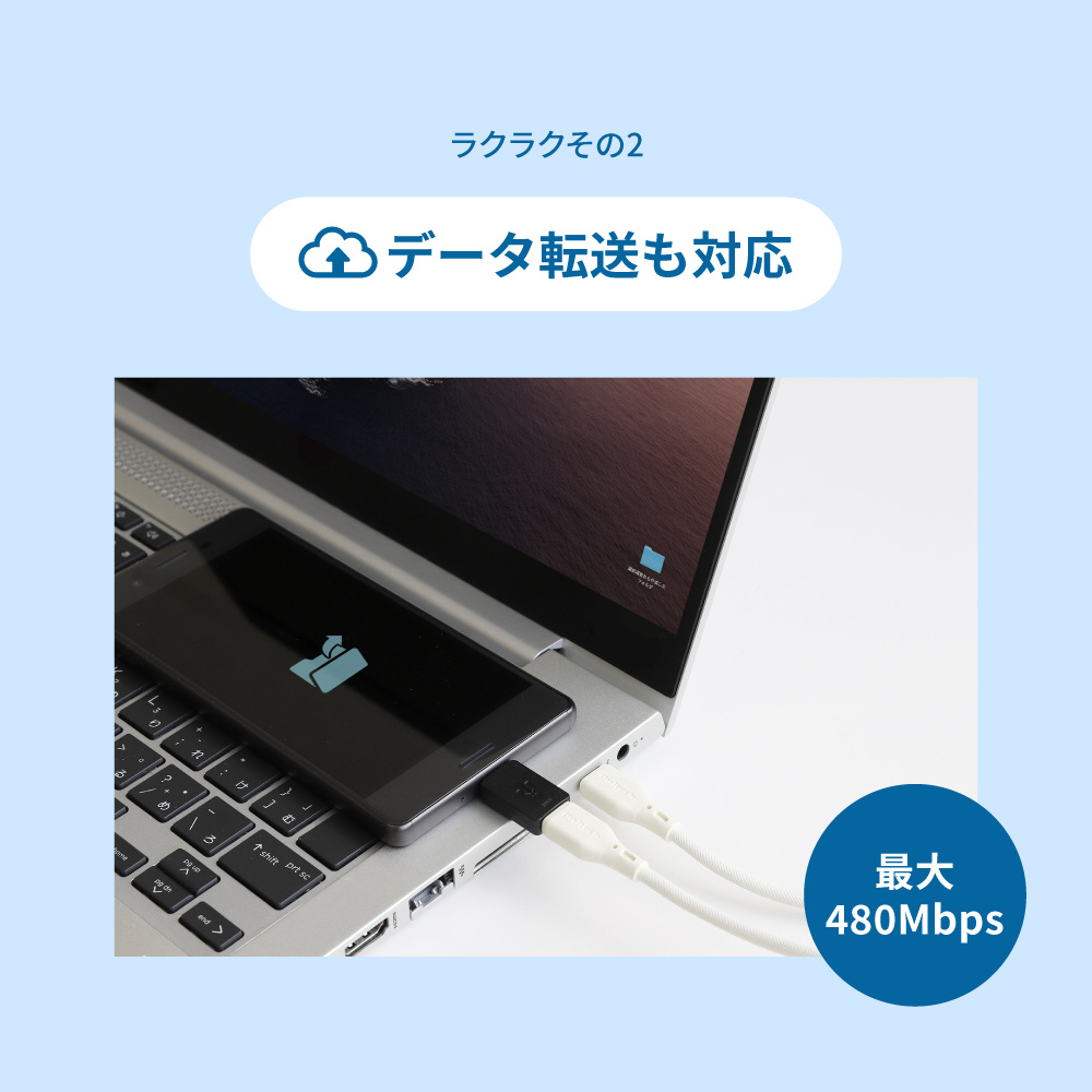 データ転送に対応しているので、スマートフォンからノートPCに写真や動画などを移動できます。