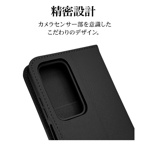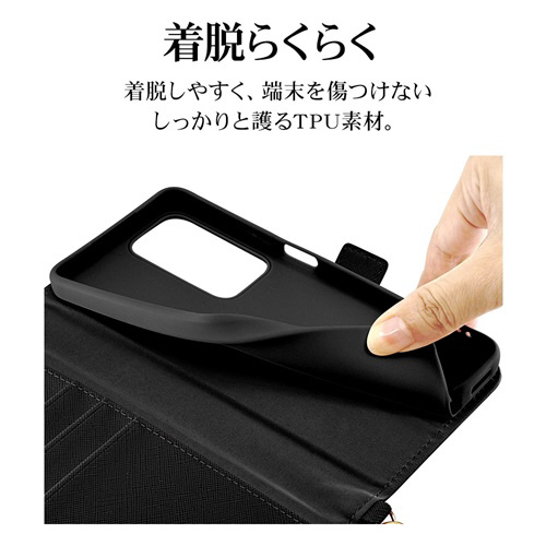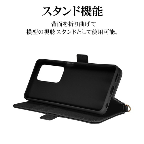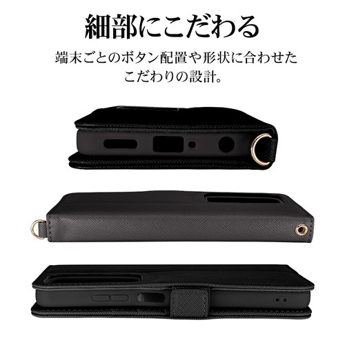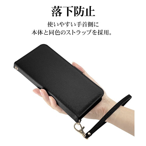 液晶画面側と背面側の両面を保護できるハンドストラップ付きの手帳型ケースです。