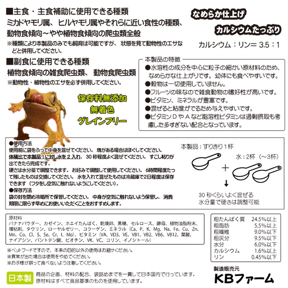 ●水溶性の成分を中心に粒子の細かい原材料のため、なめらかな仕上がりで幼体にも食べやすいです。