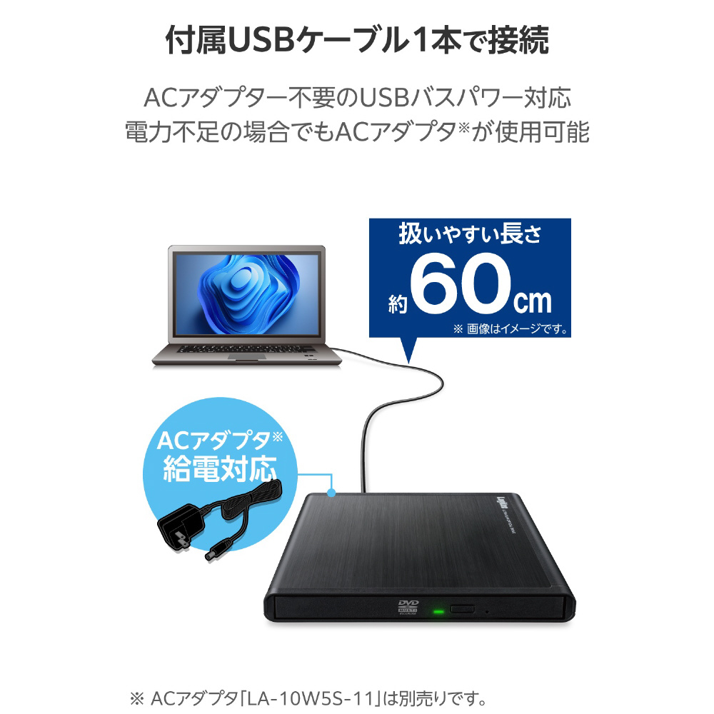 ※お使いのパソコンによっては、USBバスパワー供給が不足する場合があります。不足する場合は、別売りのACアダプタLA-10W5S-11が必要となります。