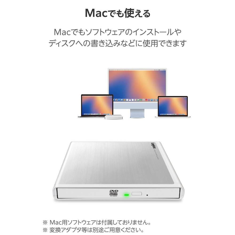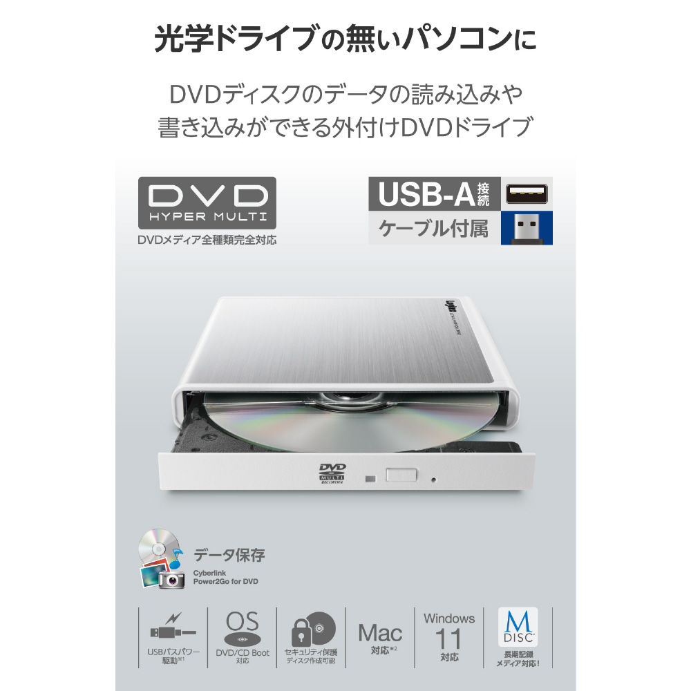 ポータブルDVDドライブ 書込ソフト:Windows用(Chrome/Mac/Windows11対応) ホワイト LDR-PMM8U2LWH [USB-A]