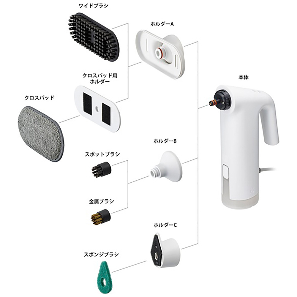 付属品 本体/計量カップ/ホルダーA/ワイドブラシ/クロスパッド(2枚)/クロスパッド用ホルダー/ホルダーB/スポットブラシ/金属ブラシ/ホルダーC/スポンジブラシ(3枚)/取扱説明書[保証書付](1)