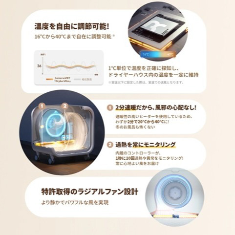 床からの温風で体全体を包み込むようにやさしく温風を送り、乾きづらいおなかやしっぽ、足先までシッカリ乾燥させます。ヘアドライヤーの様に、熱風が一部に集中しないので、やけどの心配や、乾き残しもありません。
