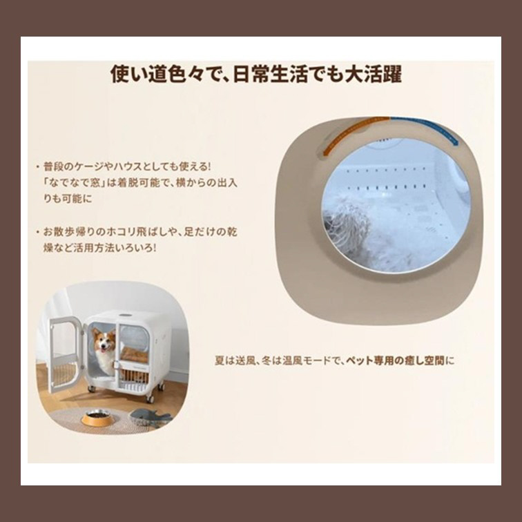 心配なのは、ペットが怖がったり、ブラッシングが必要なペットはどうするのか?です。両サイドに「なでなで窓」がついているので、乾燥中ペットを撫でて安心させてあげたり、ブラッシングをどちらの窓からも行えます。乾き残しもないか確認もできます。