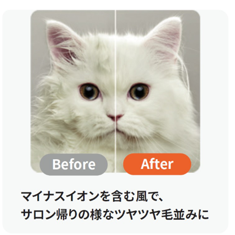 1立方センチメートル当たり300万個のマイナスイオンを含んでいます。超微細で水分をたっぷり含んだ風が、ペットサロンの帰りの様なふわふわツヤツヤに仕上がります。