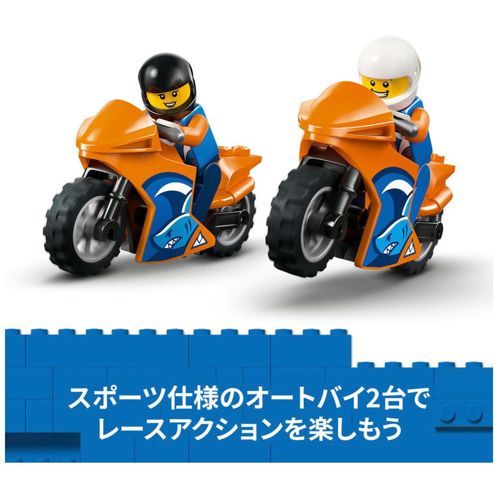 スロープを使ってオートバイを載せたり下ろしたり、オートバイ2台を走らせてスリリングなレースごっこを楽しんだり、遊ぶたびにさまざまな場面設定を楽しめます。