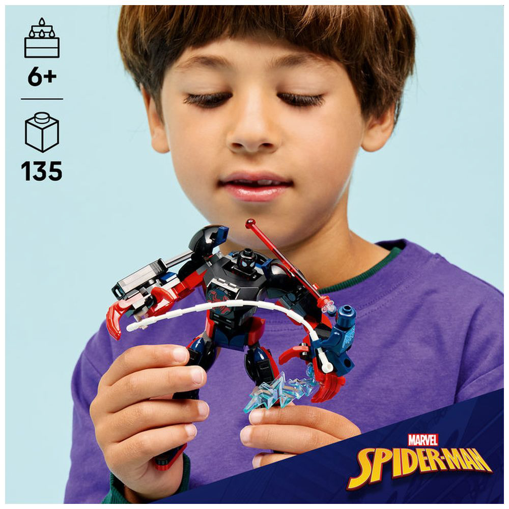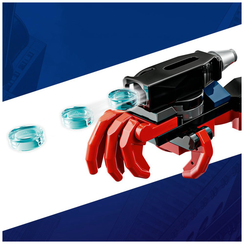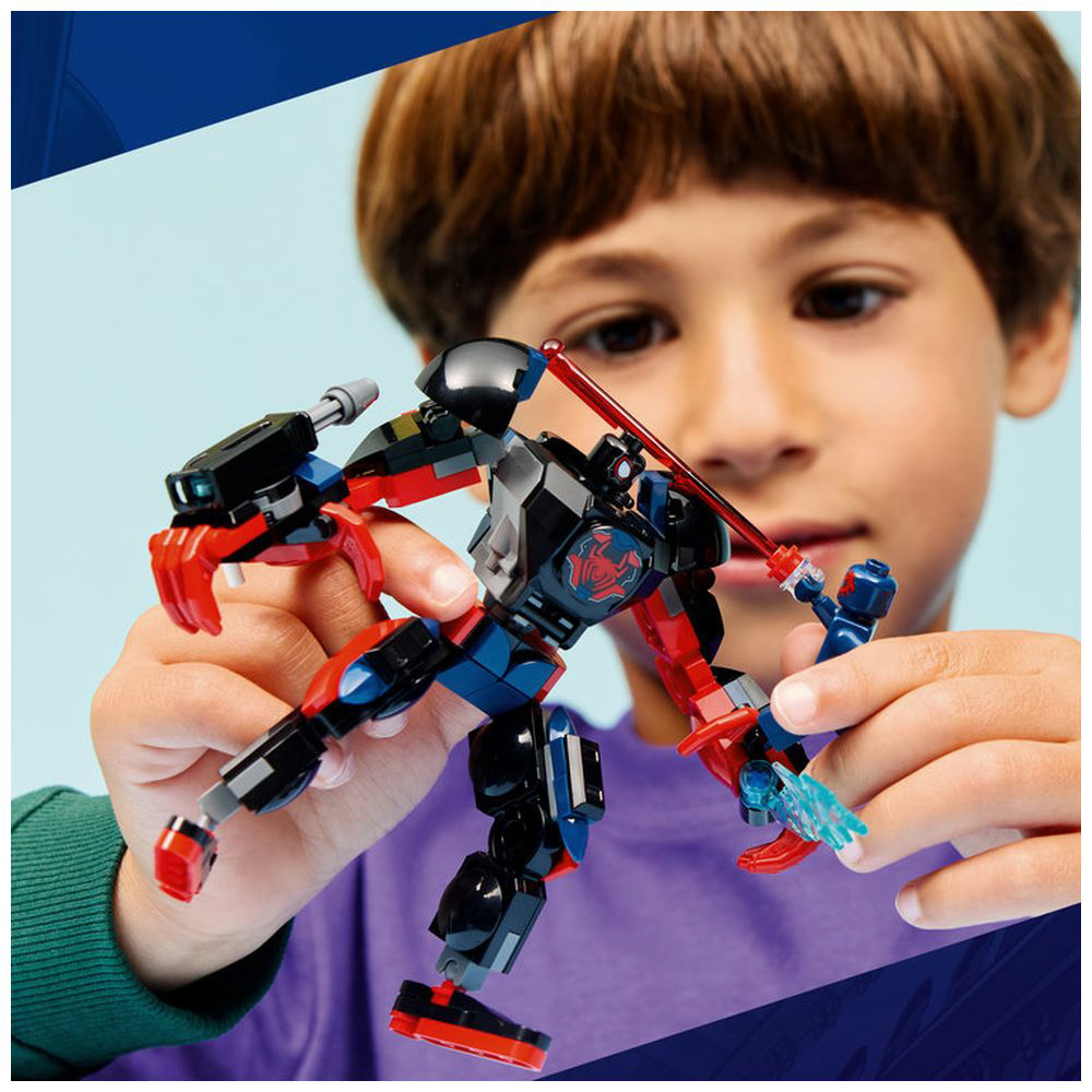 関節部が動く巨大メカスーツの可動モデルにスパイダーマンとマイルズ・モラレスのミニフィギュアが付属し、ごっこ遊びの可能性は無限大。