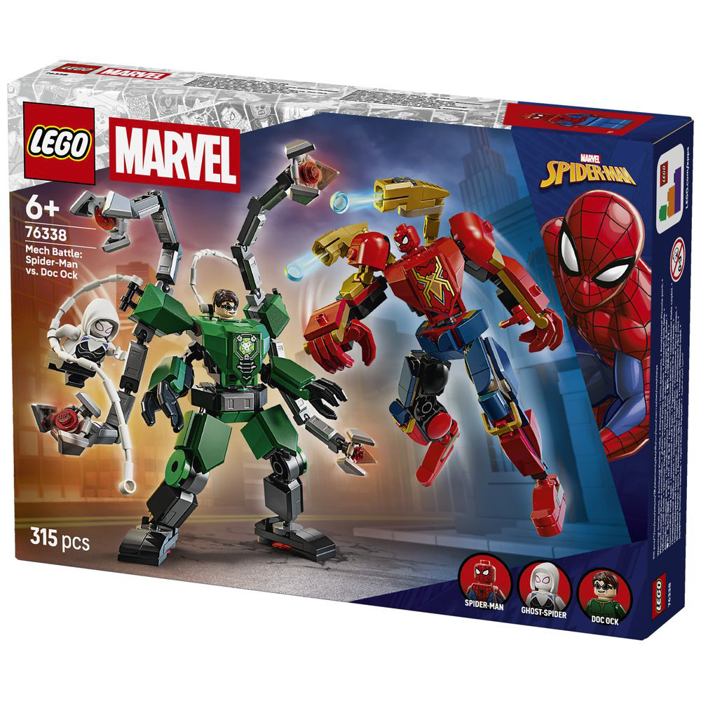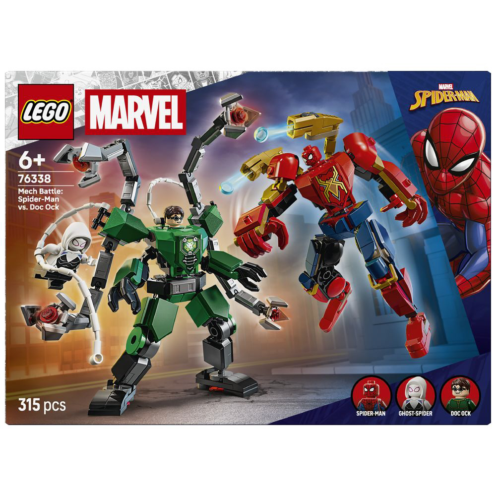 2体の可動メカスーツでカッコいいポーズを決めながら、スパイダーマン、ゴーストスパイダー、ドック・オックのミニフィギュアが活躍するスーパーヒーローの冒険を想像して遊べます。