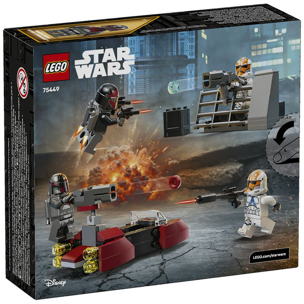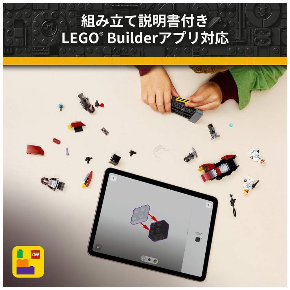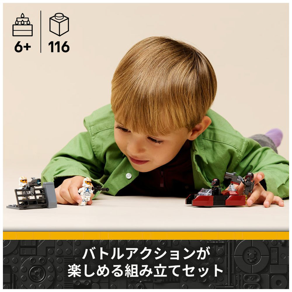 ミニフィギュア4体(「マンダロリアン・スーパー・コマンドー」2体、アソーカの第332中隊「クローン・トルーパー」2体)のほか、スピーダーやバリケード、各種アクセサリーが付属し、
