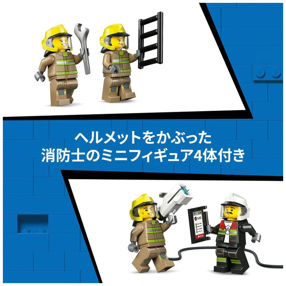 ゴム製のタイヤが6本ついたカッコいい消防トラックには、消防士のミニフィギュア4体を乗せられるコックピット付き。