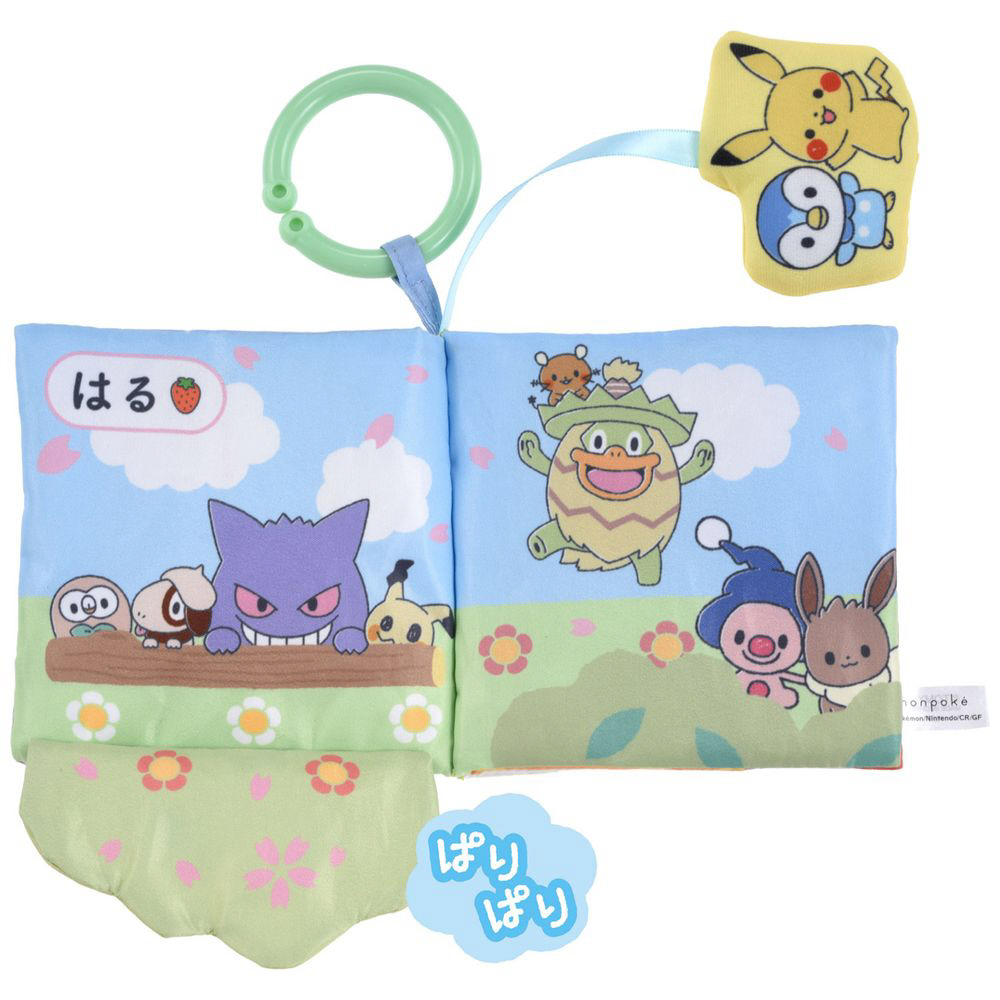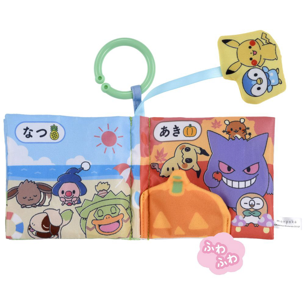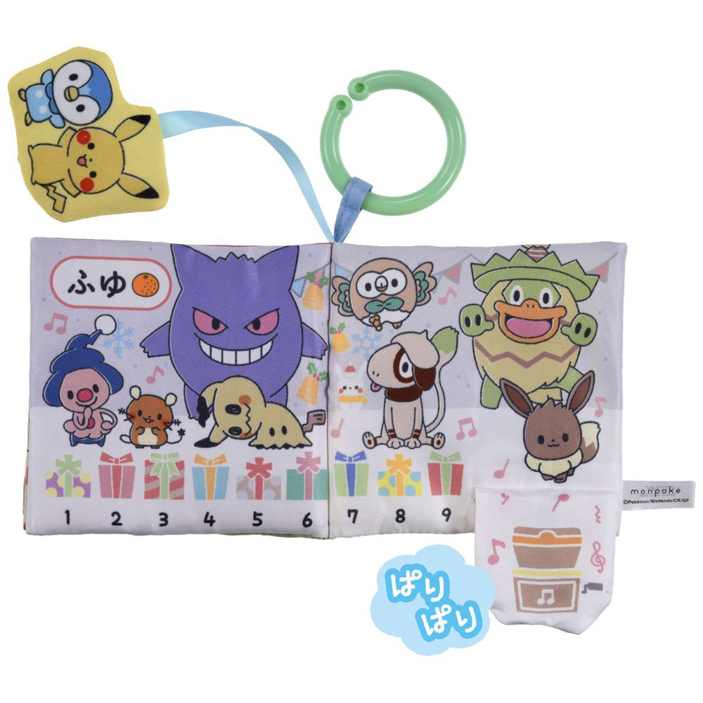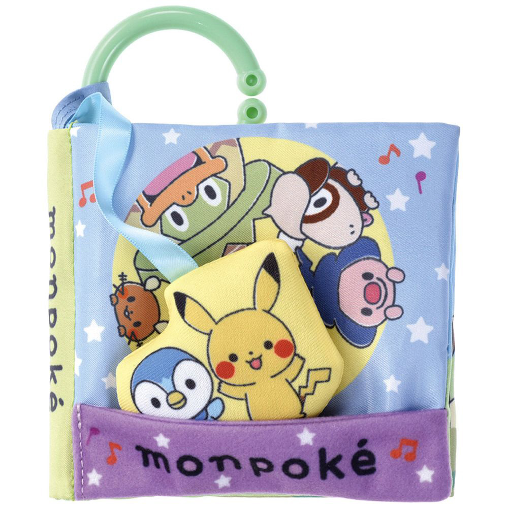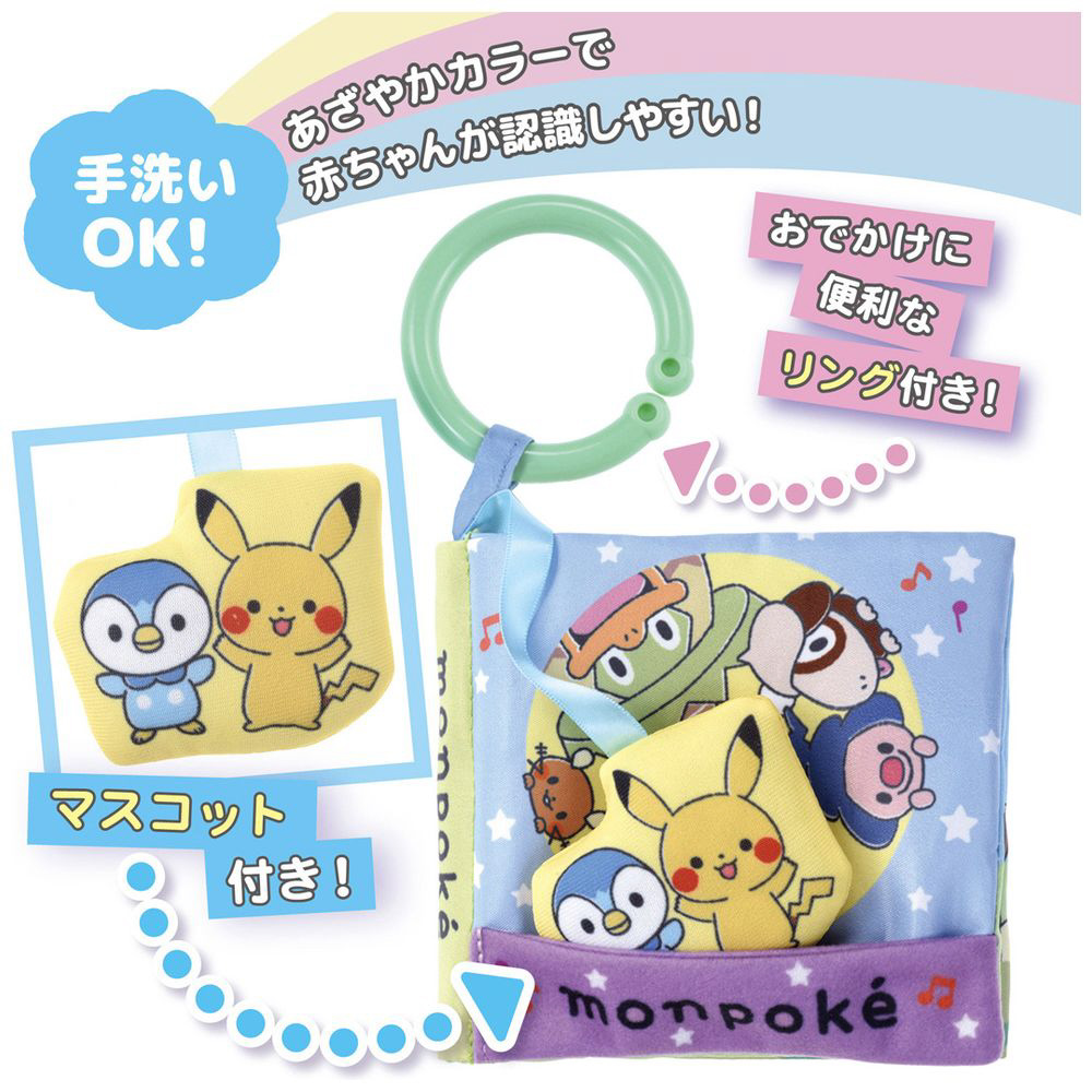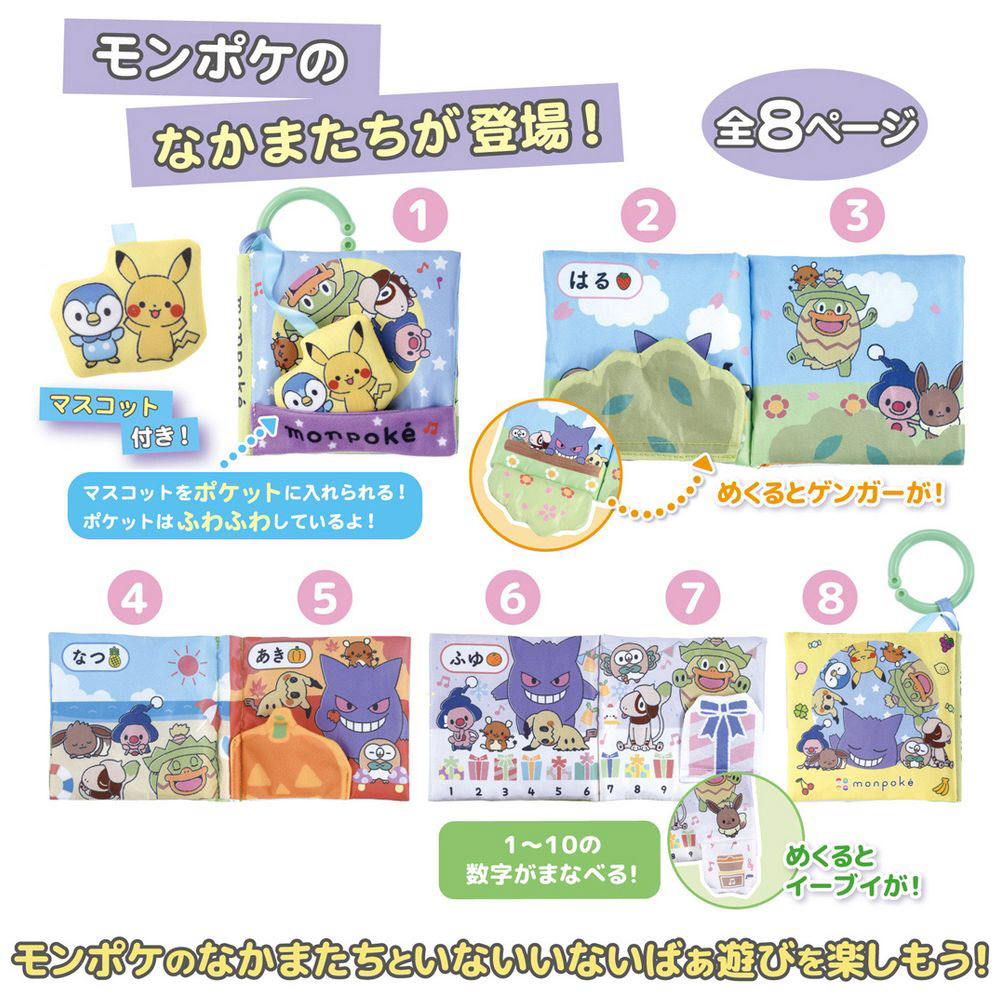 モンポケのなかまたちといっしょにいないいないばぁ遊びを楽しめる、ピカチュウとポッチャマのマスコット付きの手遊びいっぱいの布えほんです。