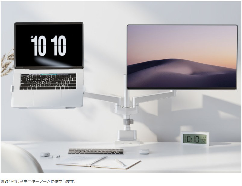 好みのモニターアームにノートPCを設置できる