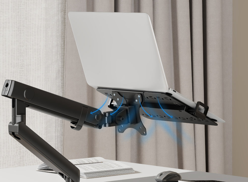 好みのモニターアームにノートPCを設置できる