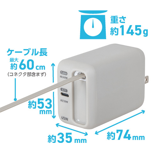 AC⇔USB-C充電器+USB-Cポート ノートパソコン・タブレットPC対応 65W [0.6m /USB Power Delivery対応] グレージュ JYU-ACR0165GY
